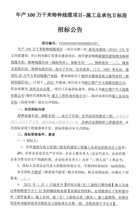 年产100万千米特种线缆项目--施工总承包Ⅱ标段招标公告